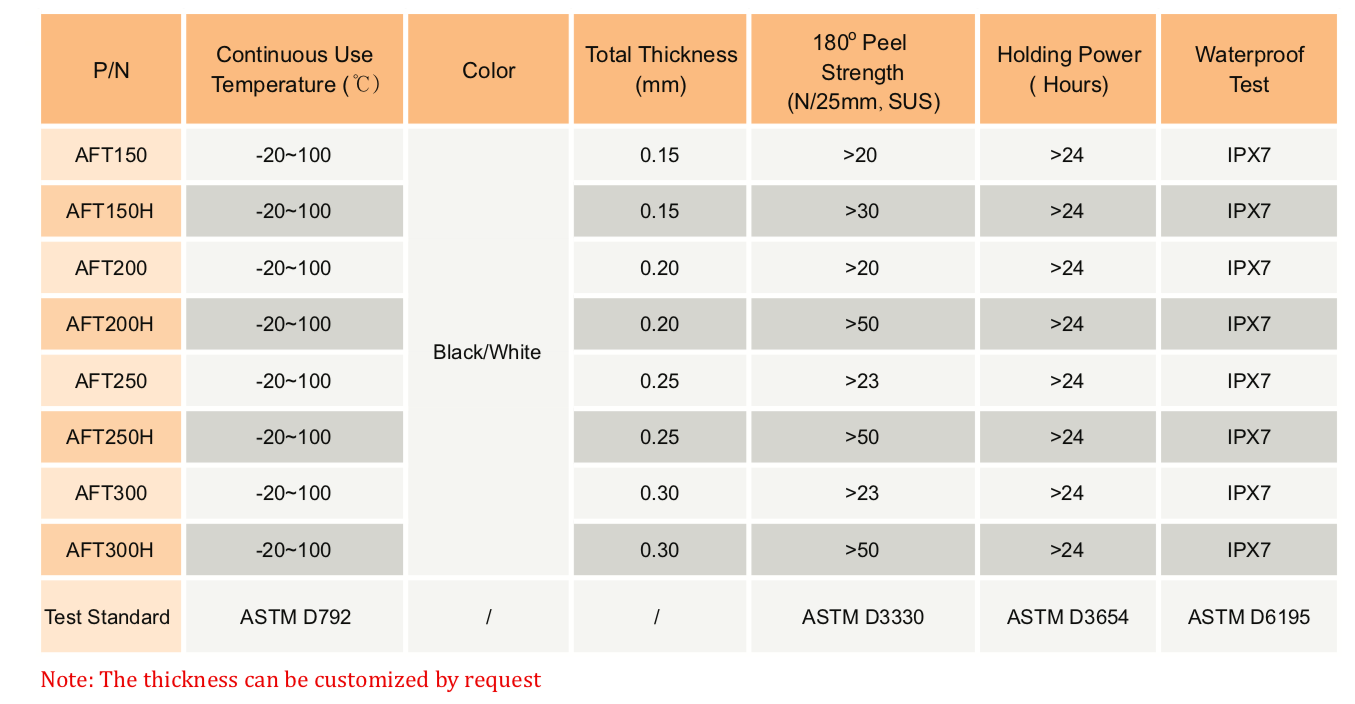 TM AFT 系列防水泡棉膠帶是一種雙面膠帶,由丙烯酸泡棉和丙烯酸粘合劑組成。這種防水泡棉帶由于其微觀和獨立的細胞結(jié)構(gòu)而非常薄和柔軟。它具有高沖擊吸收、優(yōu)異的防水性能、良好的防塵性能和回彈性。" />